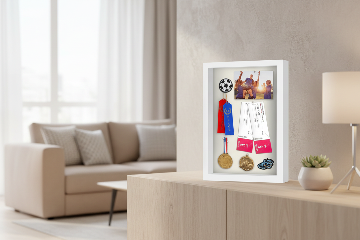 Versatile Display: The deep shadow box frame has an interior depth of 1.5 inches, offering ample space and protection for your items. Its 2.4-inch exterior depth allows for both tabletop or wall display.
